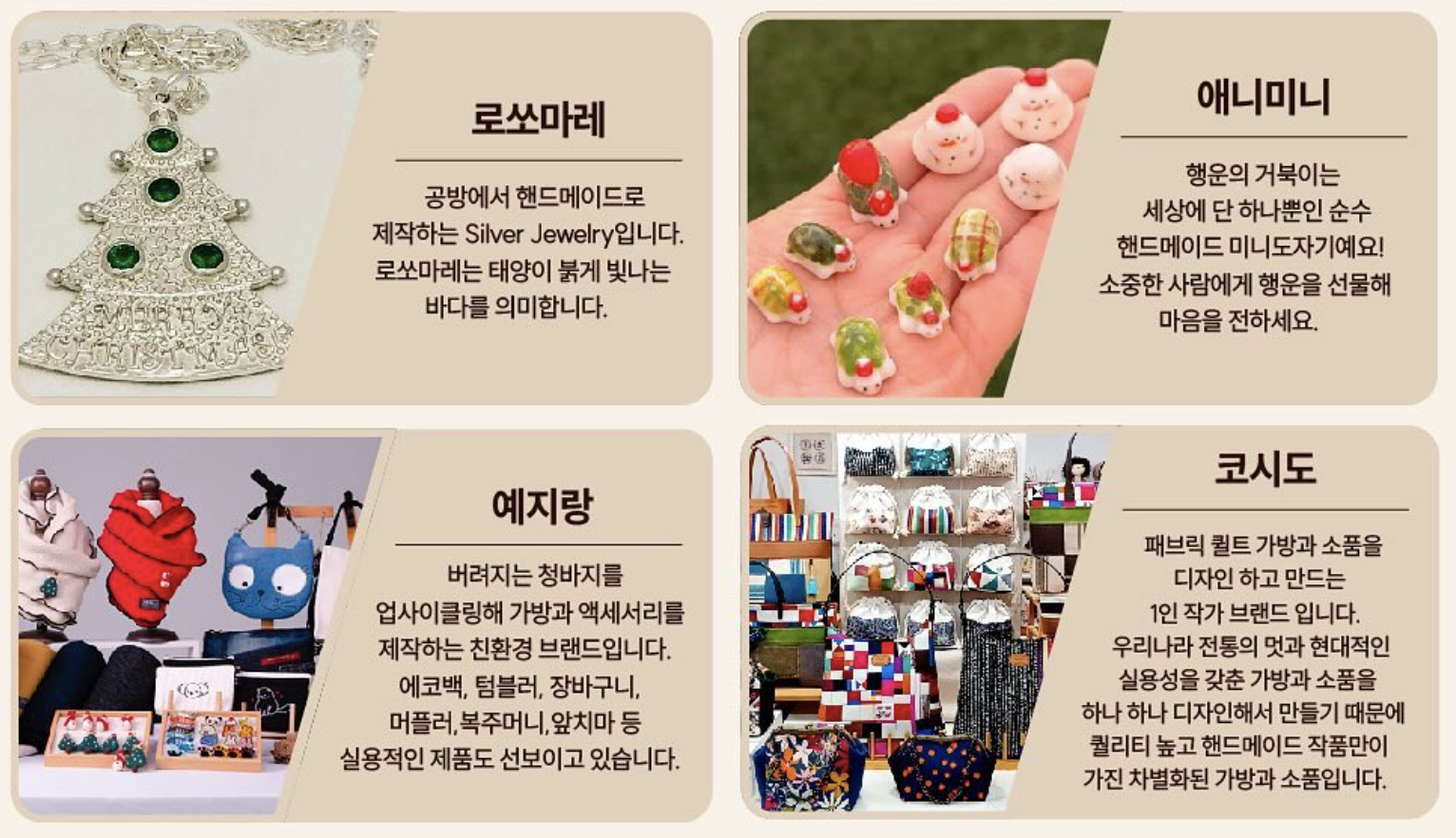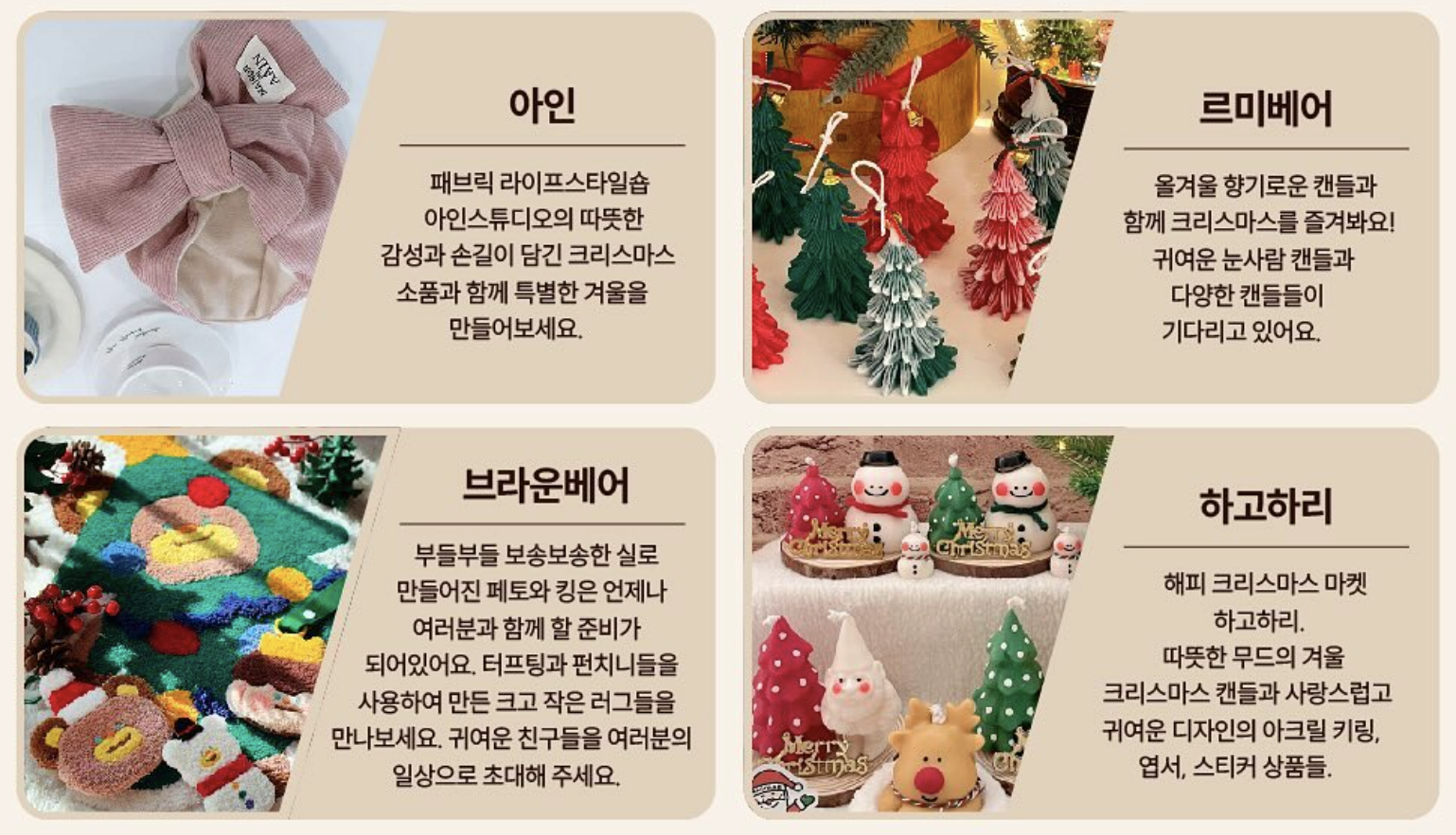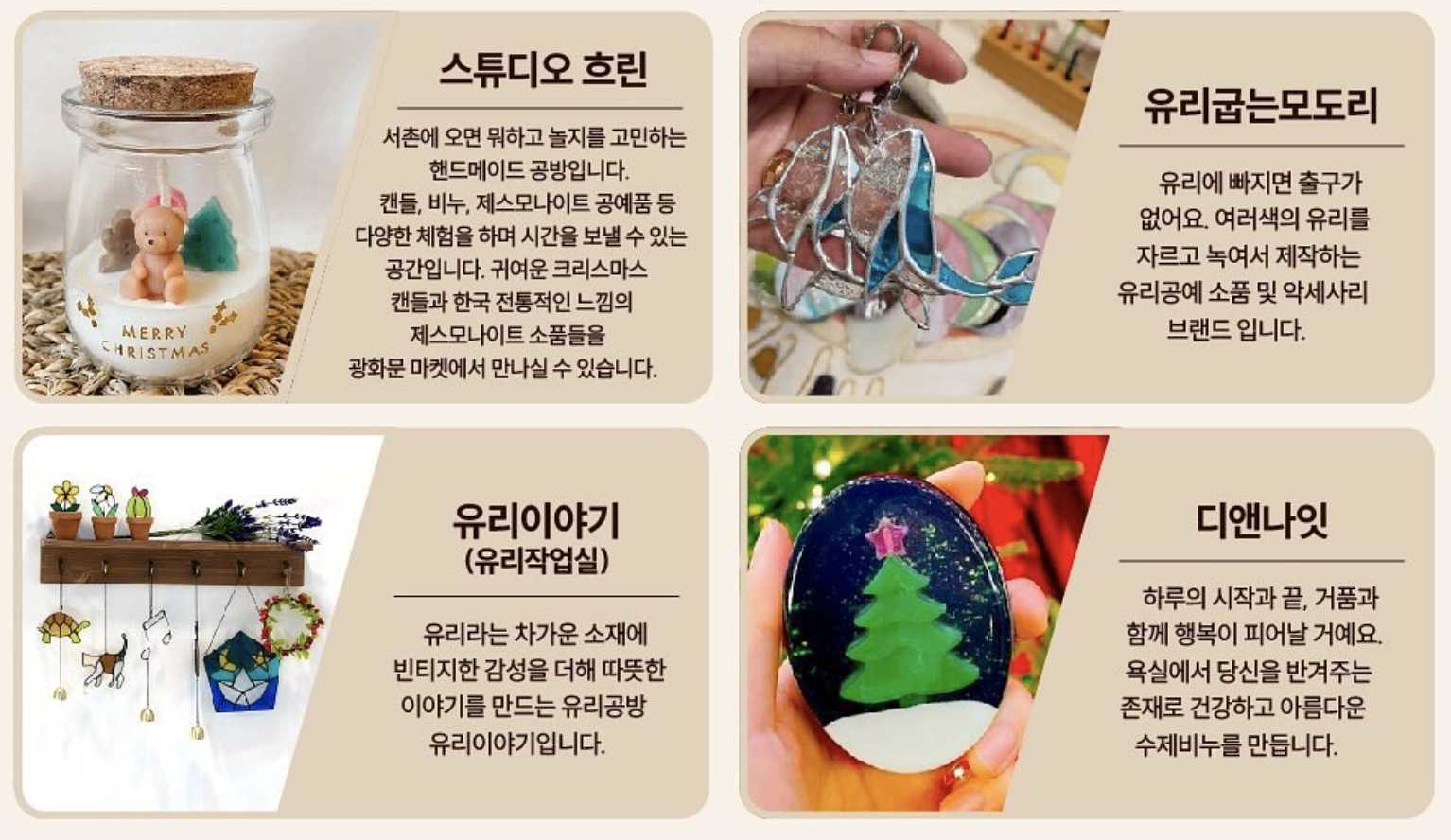 광화문 마켓에서는 약 50여 개의 핸드메이드 부스가 운영됩니다. 이곳에서는 지역 공예가들이 직접 만든 다양한 제품을 만나볼 수 있습니다. 시즌 1 기간인 12월 13일부터 12월 20일까지만 만나볼 수 있습니다.