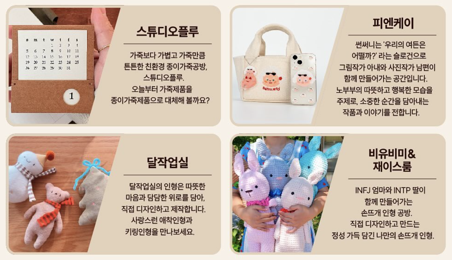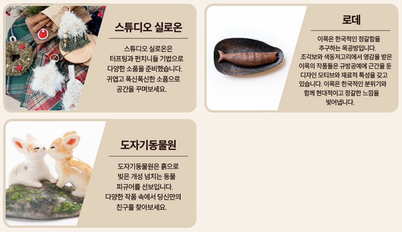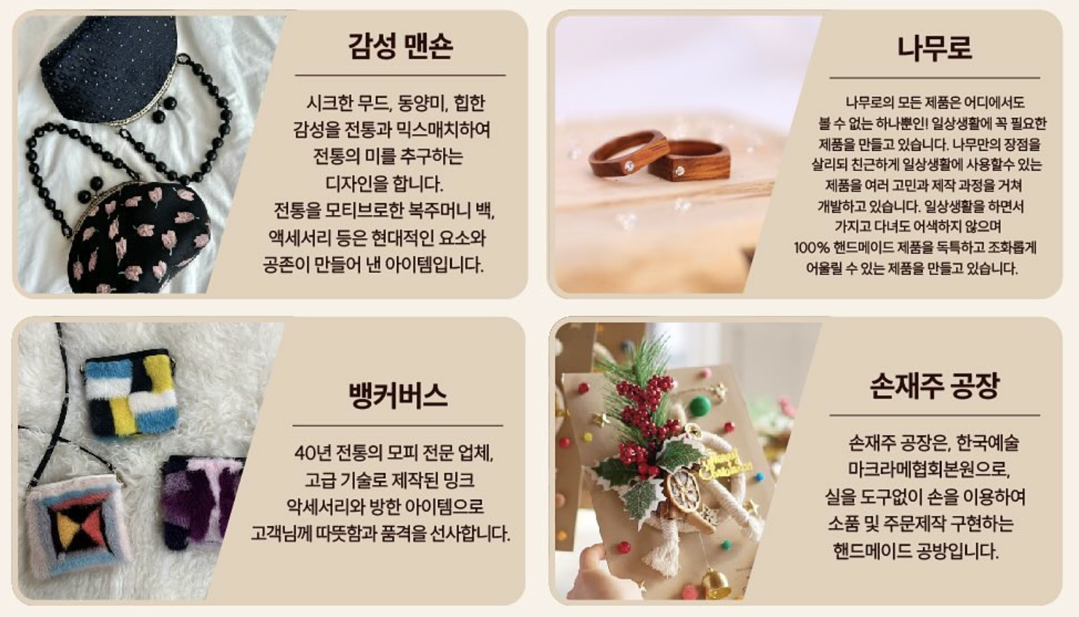 광화문 마켓에서는 약 50여 개의 핸드메이드 부스가 운영됩니다. 이곳에서는 지역 공예가들이 직접 만든 다양한 제품을 만나볼 수 있습니다. 시즌 1 기간인 12월 13일부터 12월 20일까지만 만나볼 수 있습니다.