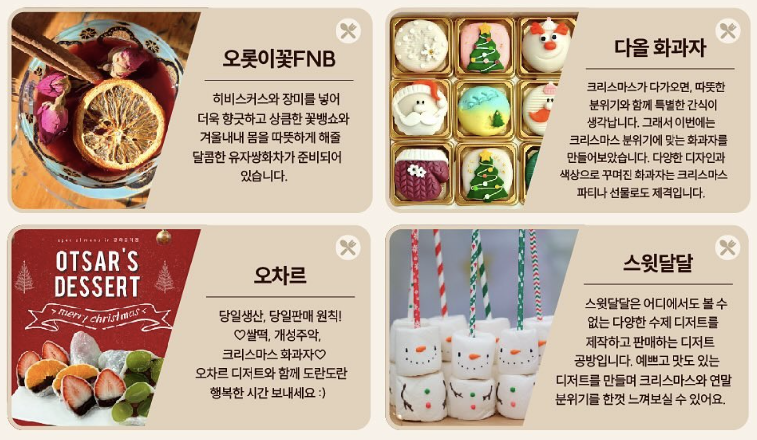 다양한 먹거리와 상품 부스에서 크리스마스 소품과 겨울 간식을 맛볼 수 있습니다. 12월 13일부터 20일까지만 만날 수 있으니 놓치지 마세요!